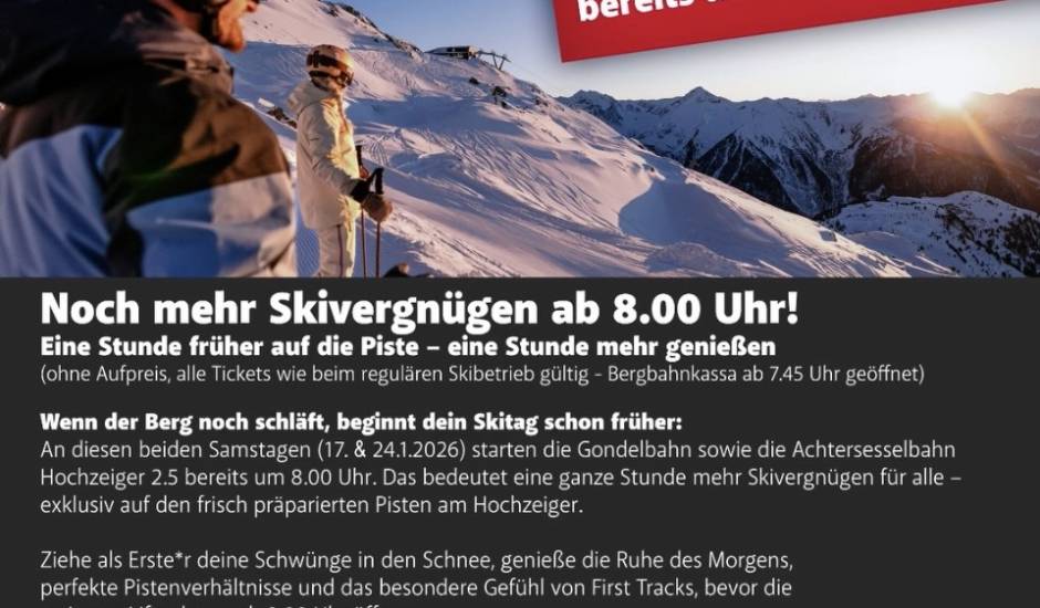 An den Samstagen, 17. und 24. Jänner 2026, starten die Gondelbahn sowie die 8er-Sesselbahn Hochzeiger 2.5 bereits um 8.00 Uhr.